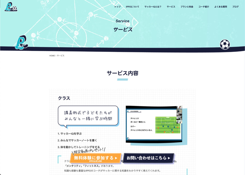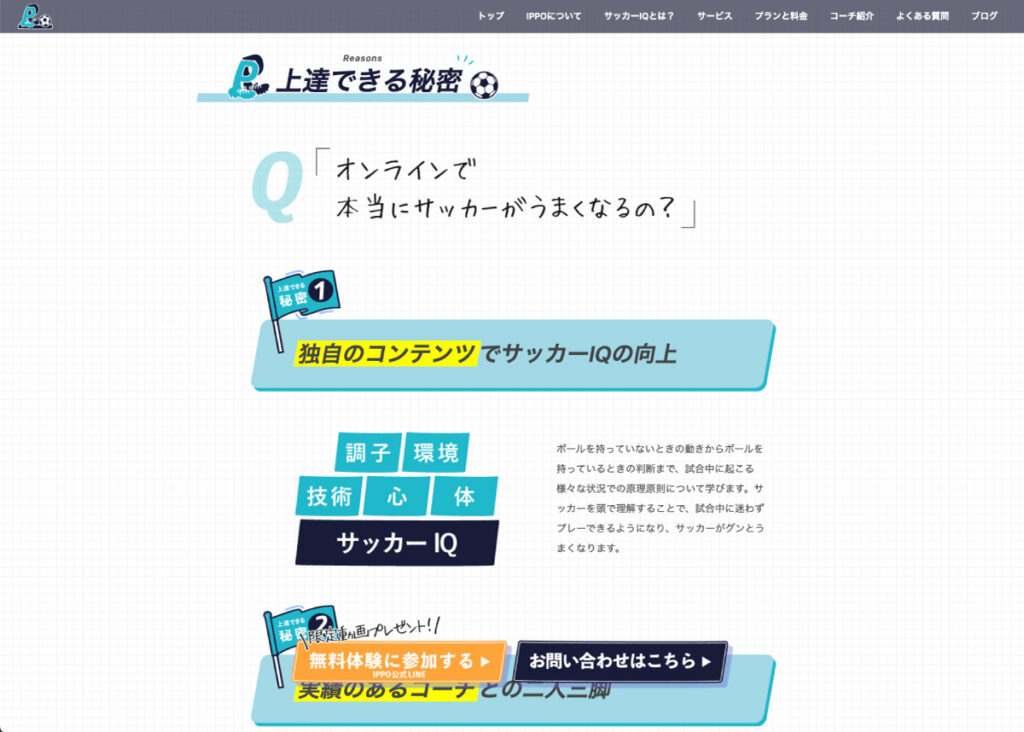 オンラインでサッカーが上達する理由を説明するために、単に情報を掲載するだけではなく、あくまで利用者であるお子さん、意思決定をする親御さんの目線を意識してデザインしました。